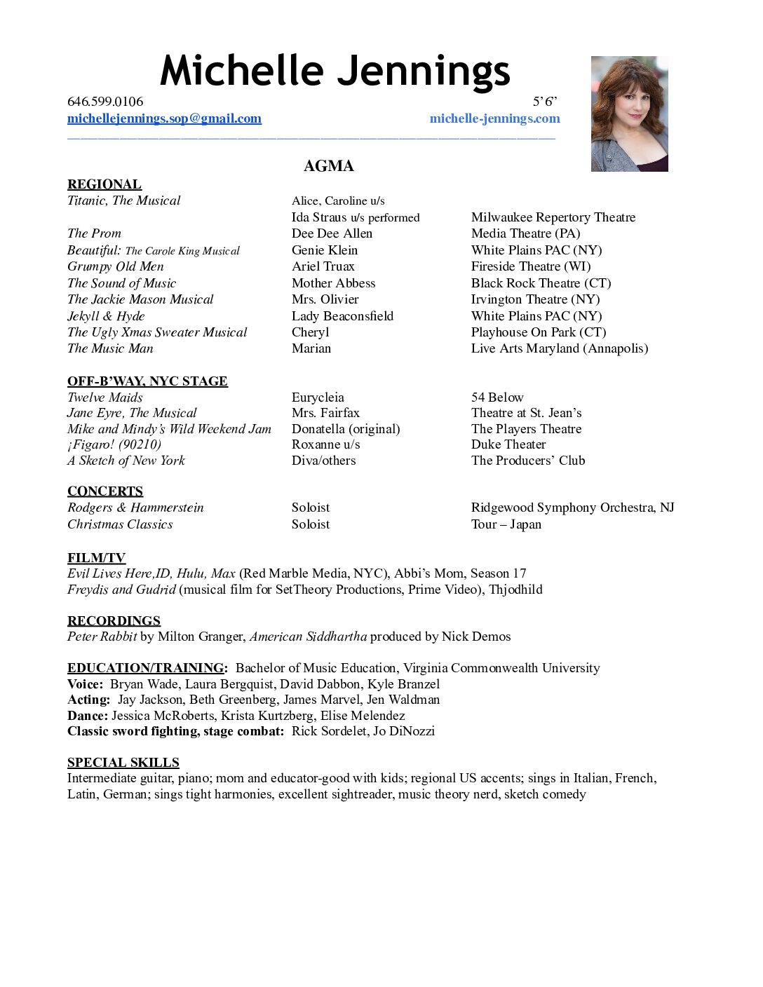 Michelle Jennings has been called “a command-ing and attractive presence on stage with an expressive voice of great beauty and power,” (Baltimore Sun). In 2024 Michelle played Genie Klein in White Plains PAC’s Beautiful: The Carole King Musical, where she later returned to be Lady Beaconsfield in Jekyll & Hyde; Mrs. Fairfax in Off-Brand Opera’s Jane Eyre (NYC); and finished the year playing perky HR Director Cheryl in Playhouse On Park’s The Ugly Xmas Sweater Musical (CT). Other recent performances include Dee Dee Allen in The Prom at Media Theatre (PA), Ariel in Fireside Theatre’s Grumpy Old Men (WI); Fiordiligi in Cosi fan Tutte, with Ninth Avenue Opera in NYC and Cleveland; Mother Abbess in The Sound of Music with Black Rock Theatre (CT); an off-stage swing for four roles in Milwaukee Rep’s production of Titanic, (going on as Ida Straus); and Donatella in the NYC premiere of Mike and Mindy’s Wild Weekend Jam, at The Players’ Theatre. In film/TV, she originated the role of Thjodhild in the film, Freydis and Gudrid, a musical film, which was released on Amazon Prime Video in 2024, and she was Abbi’s mom in Evil Lives Here, releasing early 2025 on Investigation Discovery TV and HBOMax. Other favorite lead roles in opera and musical theater performances include SweeneyTodd, The Music Man, La Cenerentola, Die Fledermaus, La Boheme, and South Pacific, performed in Virginia, Florida, Hawaii, Connecticut, New York, Oklahoma, and Washington, DC. She is also a member of the comedic opera duo, Divas Unleashed, who wrote and perform their operatic comedy show, The Benefit, around the U.S.